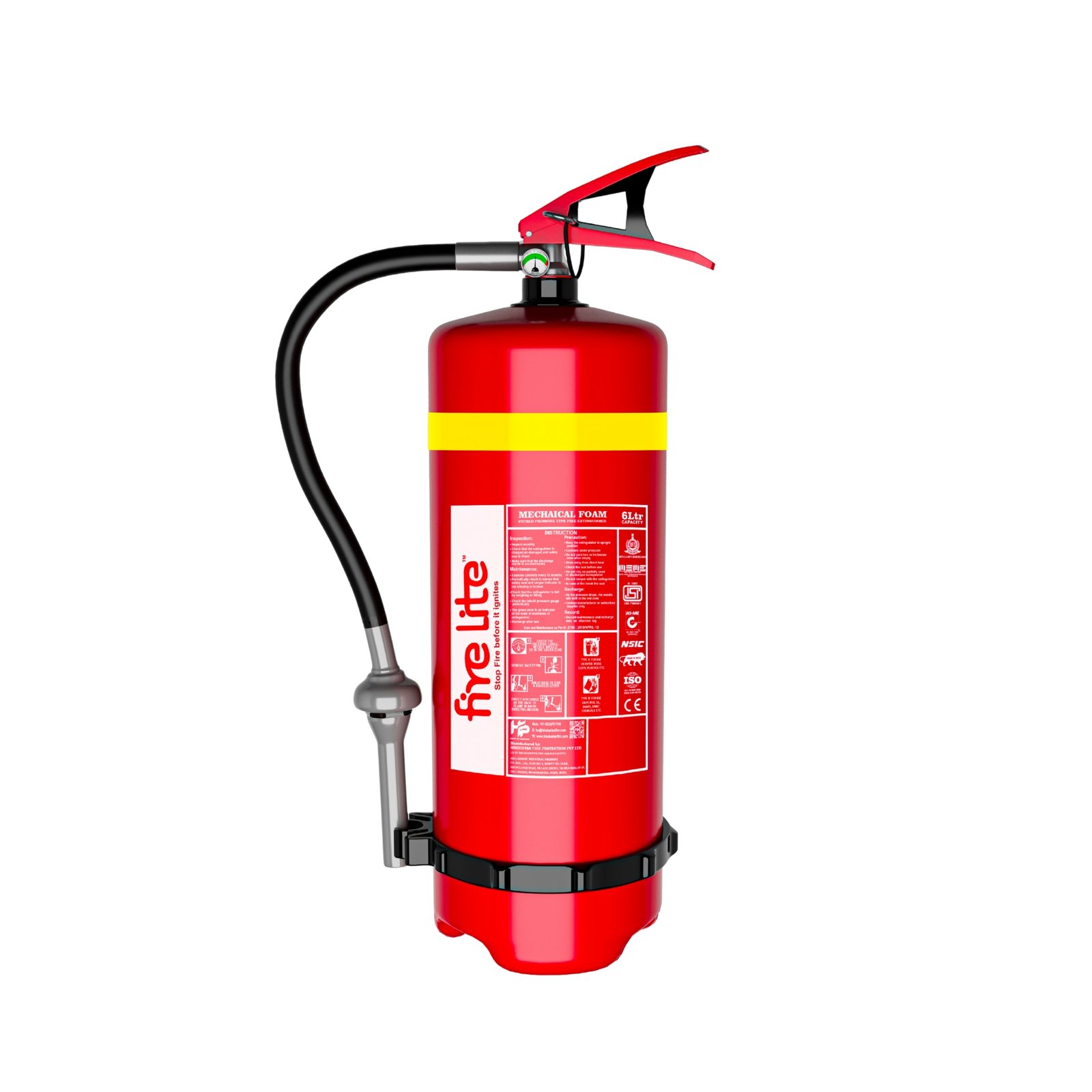 When the extinguisher is activated, the foam solution is discharged and expands as it reaches the fire. The foam spreads across the burning surface and forms a protective blanket over the fuel, separating it from oxygen and stopping the combustion process. At the same time, the foam helps cool the burning material and suppress flammable vapors, which reduces the possibility of re-ignition.